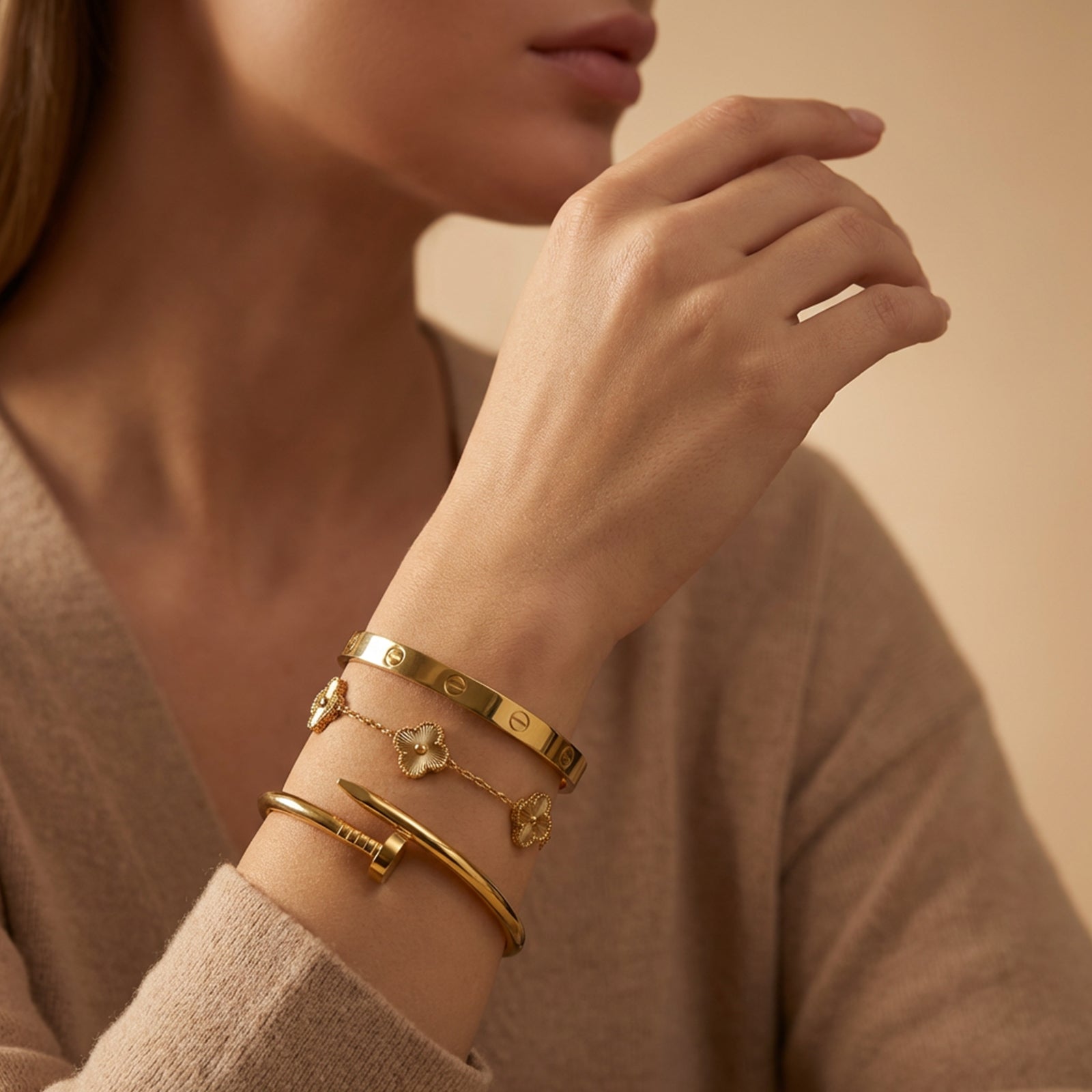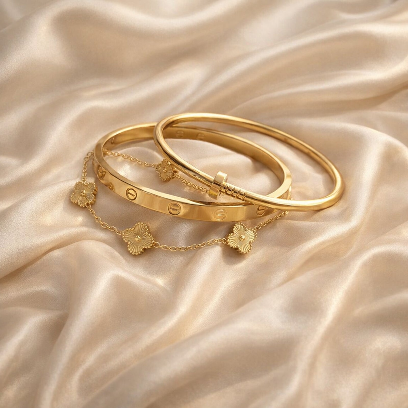 A luxurious 3-piece bracelet combo that blends classic gold shine with soft floral details.
