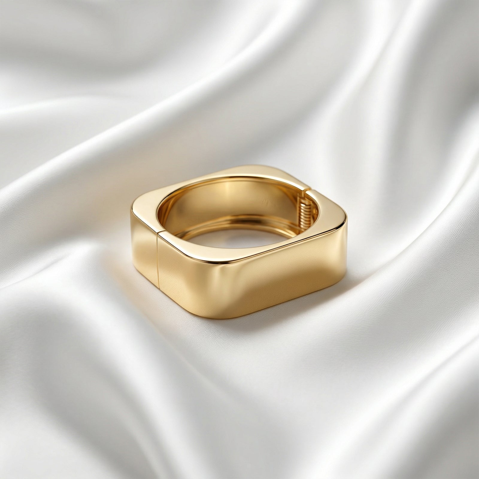 A bold square-shaped gold bangle with smooth polished edges and a modern geometric design.