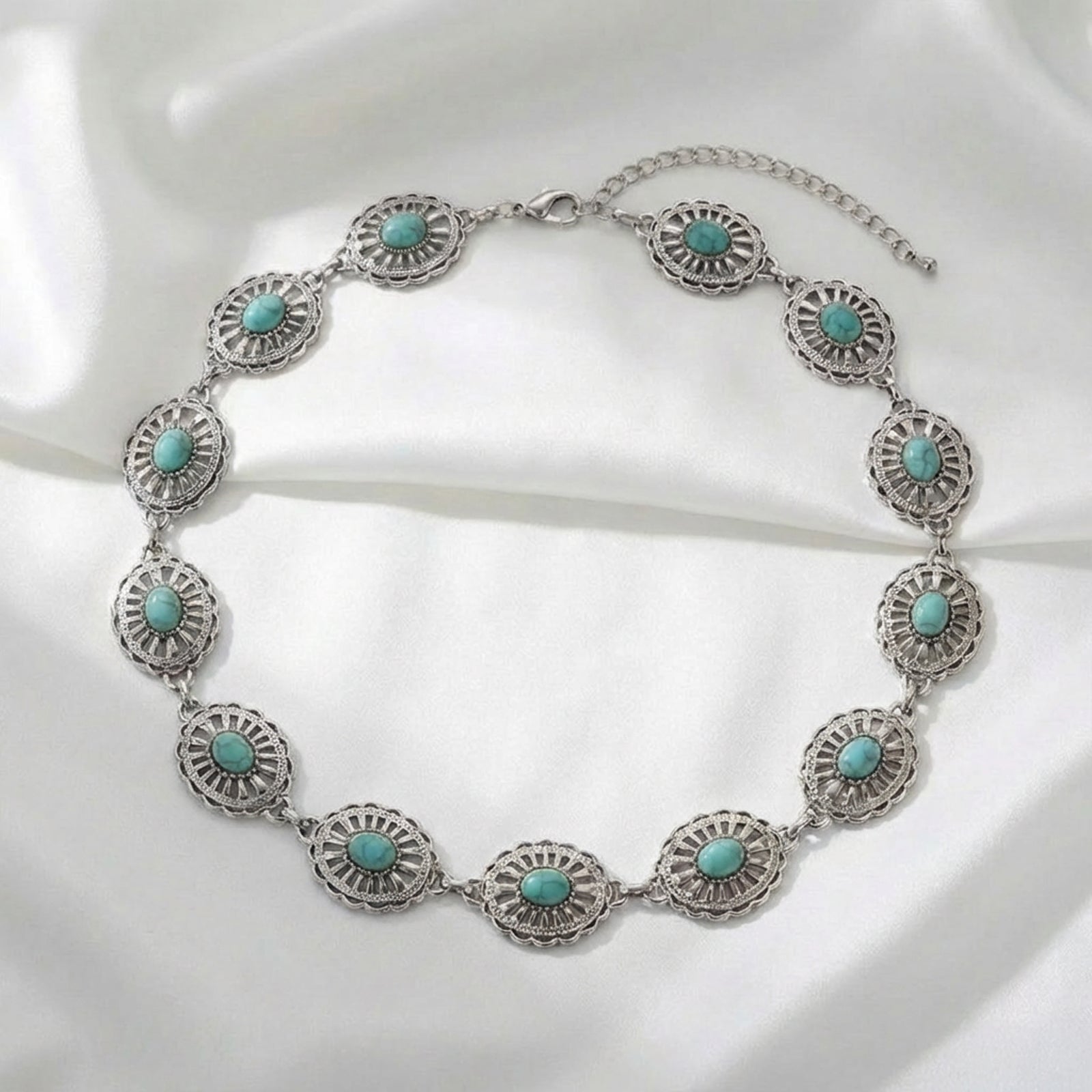 Inspired by bohemian and western elegance, the Turquoise Medallion Belt features ornate medallions with vibrant turquoise stones.